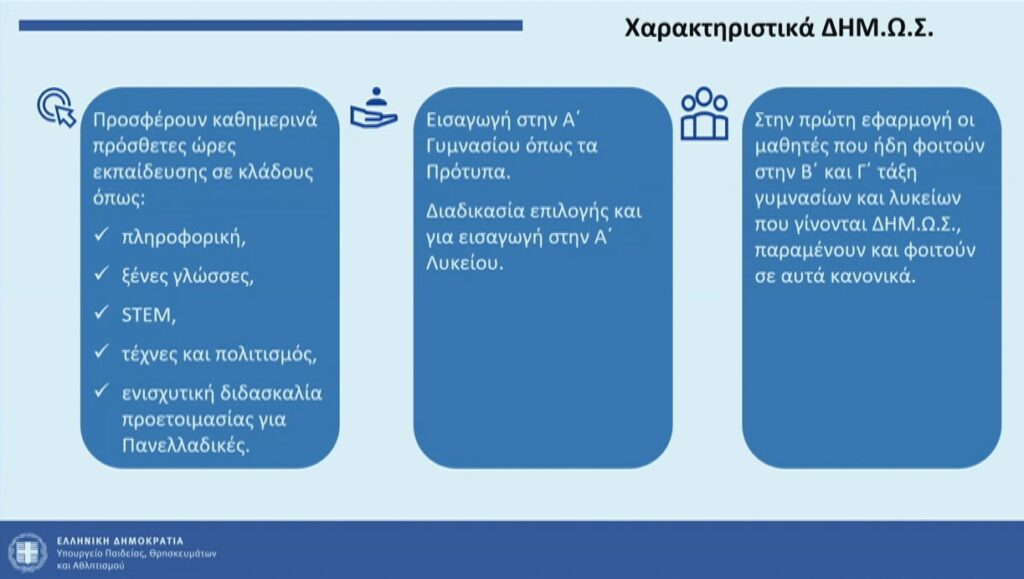 Η φοίτηση θα είναι απολύτως δωρεάν. Τα ΔΗΜ.Ω.Σ. θα ακολουθούν το πρόγραμμα των Πρότυπων Σχολείων, δίνοντας έμφαση στις Ανθρωπιστικές, Θετικές και Κοινωνικές Επιστήμες, στις Καλές Τέχνες, στην Ψηφιακή Παιδεία και στη Συναισθηματική και Κοινωνική Νοημοσύνη. Για την επίτευξη των στόχων, εκτός από το ωρολόγιο πρόγραμμα που ισχύει για τα Πρότυπα Σχολεία, θα λειτουργούν Όμιλοι και Σύνολα, με πρόσθετα αντικείμενα στις Θετικές και Ανθρωπιστικές Επιστήμες, στις Γλώσσες, στην Τέχνη, στον Πολιτισμό και στον Αθλητισμό. Στους Ομίλους θα πραγματοποιούνται καινοτόμες δράσεις, ενισχυτική διδασκαλία και προετοιμασία για τις Πανελλαδικές εξετάσεις.