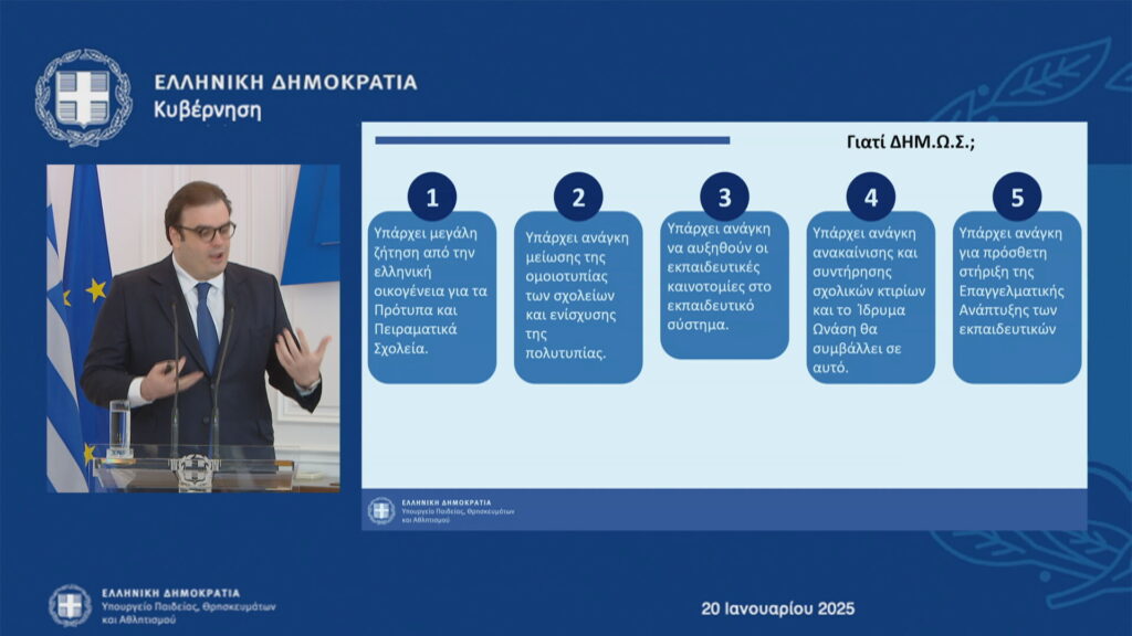 Επιπλέον, ο κ. Πιερρακάκης εξήγησε πως «θα πάρουμε 22 υφιστάμενα δημόσια σχολεία -11 γυμνάσια και 11 λύκεια – θα υπάρχει 9μελης διοικούσα επιτροπή με συμμετοχή του Δωρητή όπως συμβαίνει με το Ωνάσειο» και τόνισε πως «τη στιγμή λειτουργίας ευελπιστούμε πως θα φτάσει τους 6.000» ενώ ο στόχος είναι να ξεκινήσουν τα 6 πρώτα σχολεία τον Σεπτέμβριο του 2025 και να ολοκληρωθούν και τα 22 έως τον Σεπτέμβριο του 2026.
