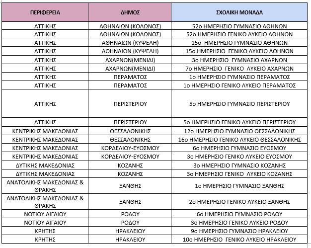 Οι 11 περιοχές που επελέγησαν είναι: Κολωνός και Κυψέλη, Μενίδι, Πέραμα, Περιστέρι, Κορδελιό, Κοζάνη, Ξάνθη, Ρόδος και Ηράκλειο Κρήτης, ενώ στόχος είναι τα 6 πρώτα σχολεία να είναι έτοιμα στην έναρξη της επόμενης σχολικής χρονιάς και τα υπόλοιπα να έχουν ολοκληρωθεί έως το τέλος του 18μηνου, δηλαδή τον Σεπτέμβριο του 2026.