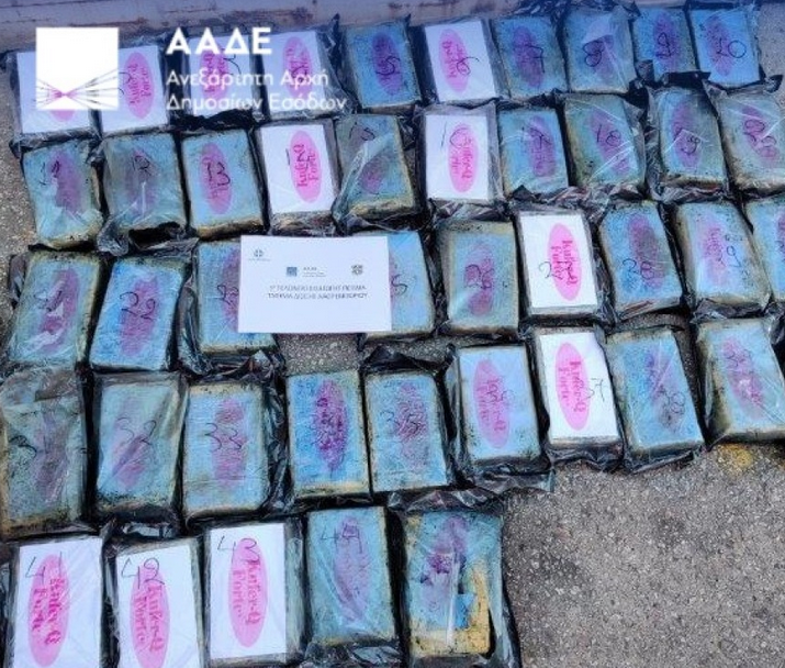 Μετά από θετική ένδειξη και του σκύλου ανιχνευτή ναρκωτικών KYBERR ακολούθησε φυσικός έλεγχος, όπου κατασχέθηκαν 45 συσκευασίες με κοκαΐνη, συνολικού μεικτού βάρους 54 κιλών.