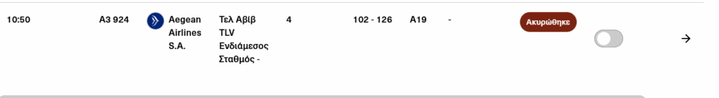 Με ανακοίνωσή της η Aegean γνωστοποίησε πως οι πτήσεις Α3924, Α3925, A3926, A3927, Α3526, Α3527 με προορισμό ή πόλη αναχώρησης το Τελ Αβίβ ακυρώνονται.