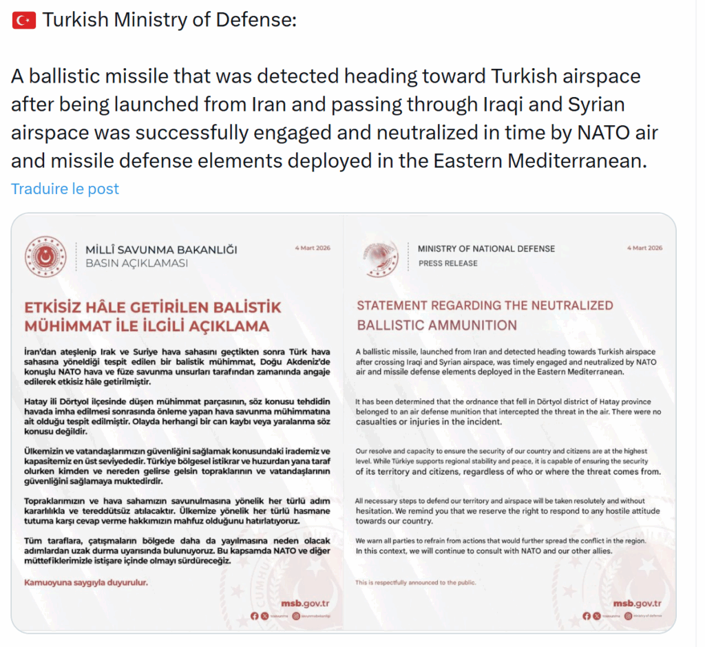 «Ένας βαλλιστικός πύραυλος που εντοπίστηκε να κατευθύνεται προς τον τουρκικό εναέριο χώρο μετά την εκτόξευσή του από το Ιράν και τη διέλευσή του από τον ιρακινό και συριακό εναέριο χώρο, εξουδετερώθηκε με επιτυχία και εγκαίρως από στοιχεία αεροπορικής και πυραυλικής άμυνας του ΝΑΤΟ που αναπτύχθηκαν στην Ανατολική Μεσόγειο.