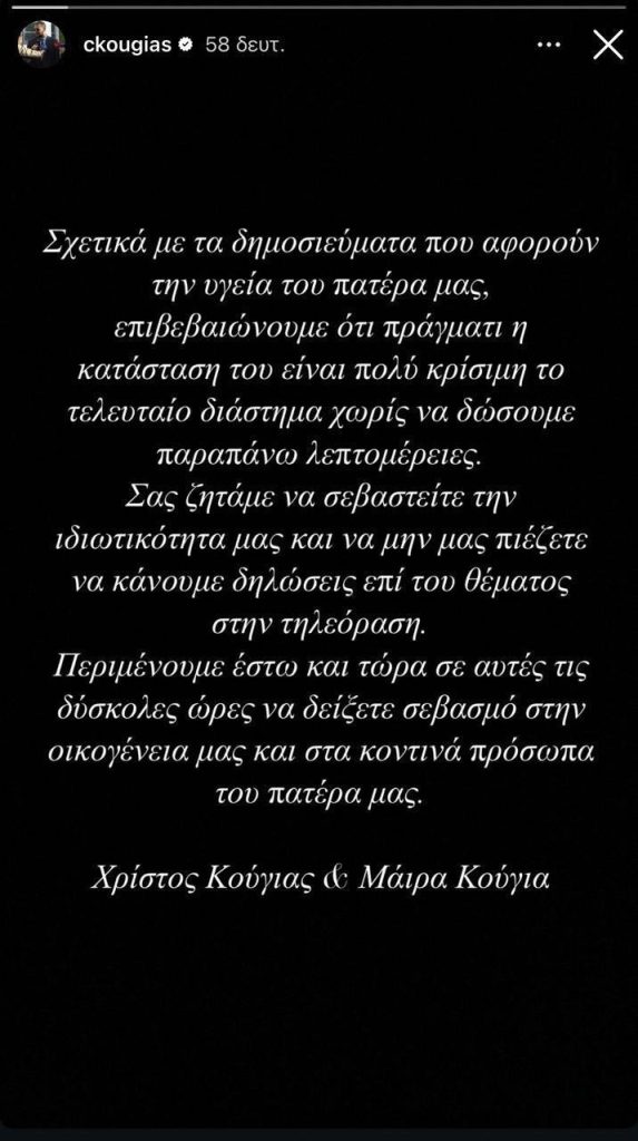 2 thoughts on “Αλέξης Κούγιας: Πολύ κρίσιμη η κατάστασή του – Η ανακοίνωση των παιδιών του”