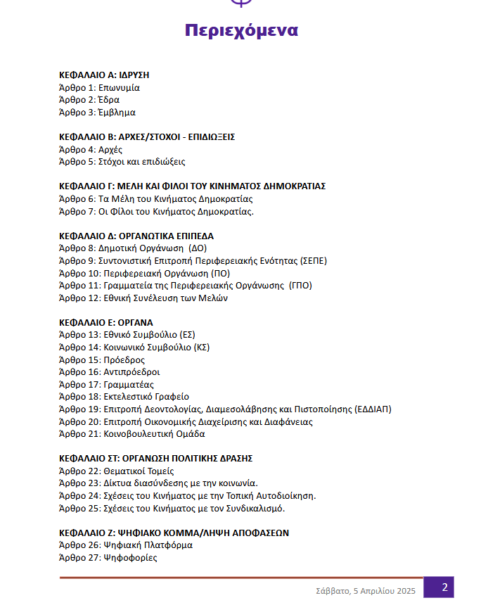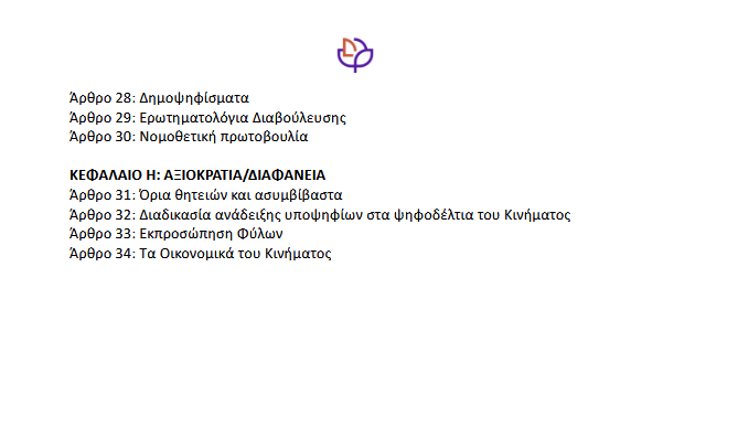 Πρόκειται για ένα καταστατικό καινοτόμο, άμεσα δημοκρατικό και αμιγώς ψηφιακό – το πρώτο του είδους του στην ελληνική πολιτική σκηνή – το οποίο καθιερώνει θεσμούς ισοτιμίας, διαφάνειας και ουσιαστικής συμμετοχής των πολιτών.