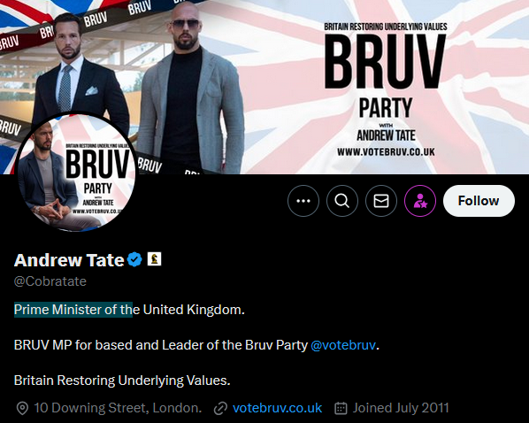 Ο Andrew Tate έχει σχηματίσει ένα πολιτικό κόμμα που ονομάζεται «BRUV», («Η Βρετανία αποκαθιστά τις υποκείμενες αξίες»).