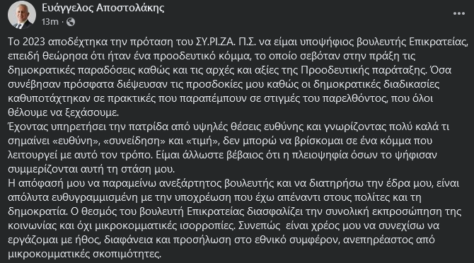 Σε ανάρτησή του στα social media ο κ. Αποστολάκης εξήγησε τους λόγους της απόφασής του, αναφέροντας τα ακόλουθα:
