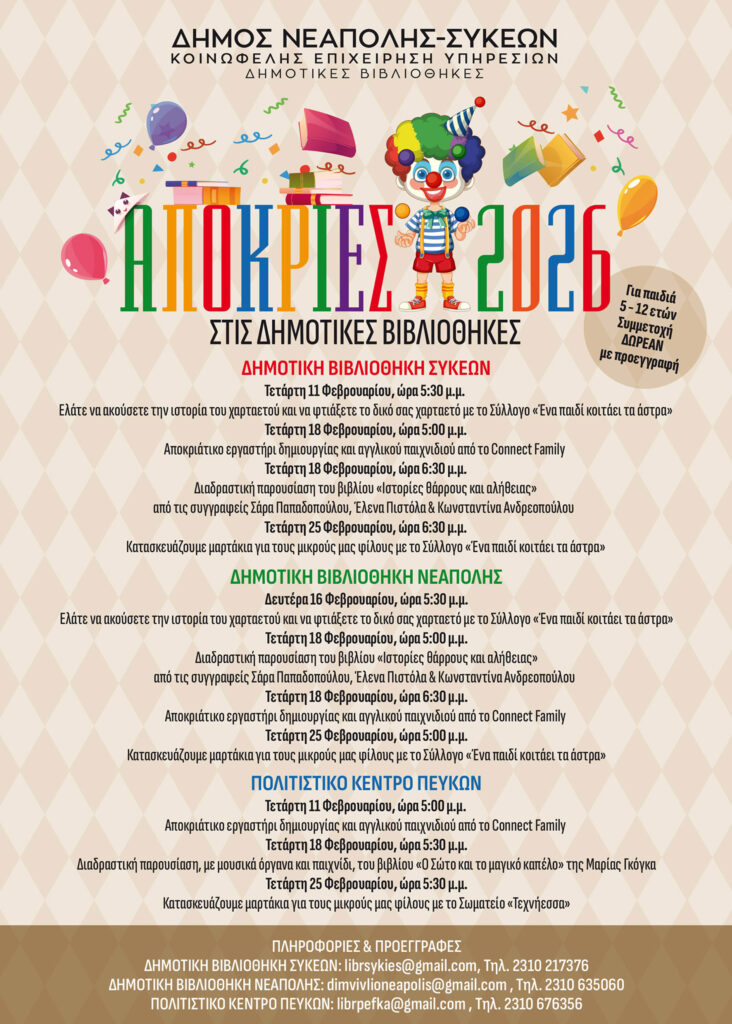 Όλες οι αποκριάτικες εκδηλώσεις και στις τρεις Δημοτικές Βιβλιοθήκες απευθύνονται σε παιδιά από 5 έως 12 ετών και η συμμετοχή είναι ΔΩΡΕΑΝ με προεγγραφή.