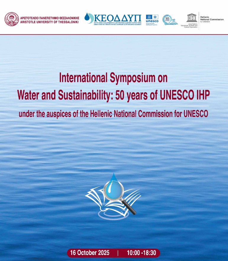 Διεθνές Συμπόσιο, με τίτλο: «Νερό και Βιωσιμότητα: 50 χρόνια Διακυβερνητικού Υδρολογικού Προγράμματος (IHP) της UNESCO», διοργανώνει το Κέντρο UNESCO C2C Ολοκληρωμένης και Διεπιστημονικής Διαχείρισης Υδατικών Πόρων του Αριστοτελείου Πανεπιστημίου, την Πέμπτη 16 Οκτωβρίου 2025 και ώρα 10.00, στο ΚΕΔΕΑ.