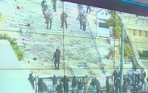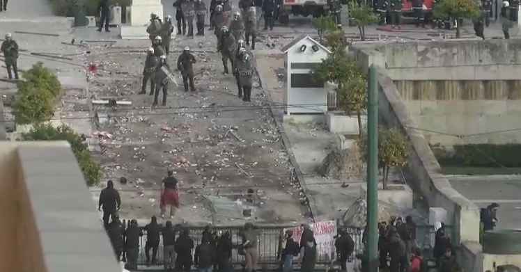 Νωρίτερα, οι εικόνες στην πόρτα της Βουλής με τους κουκουλοφόρους και τους αστυνομικούς ήταν πάντως διαφορετική. Οι γνωστοί-άγνωστοι είχαν ανοίξει την πόρτα του προαύλιο της Βουλής, μπήκαν μέσα, άρπαξαν πέτρες τις οποίες πετούσαν προς τους αστυνομικούς. Άλλοι κουκουλοφόροι ήταν κρεμασμένοι στην πόρτα ενώ άτομο φαίνεται με μεγάλη πέτρα να σπάει το τοιχίο στα ανθοπωλεία της Βουλής, ώστε να προμηθευτεί νέα “πολεμοφόδια”.