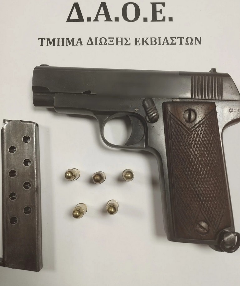 Ειδικότερα, ο ανωτέρω εντοπίστηκε από αστυνομικούς του Τμήματος Δίωξης Εκβιαστών, στο πλαίσιο ελέγχων σε καταστήματα υγειονομικού ενδιαφέροντος στην ευρύτερη περιοχή της Αττικής, να φέρει μέσα σε τσαντάκι πιστόλι με γεμιστήρα, που περιείχε -5- φυσίγγια, ενώ επιπλέον κατασχέθηκαν και -2- κινητά τηλέφωνα.