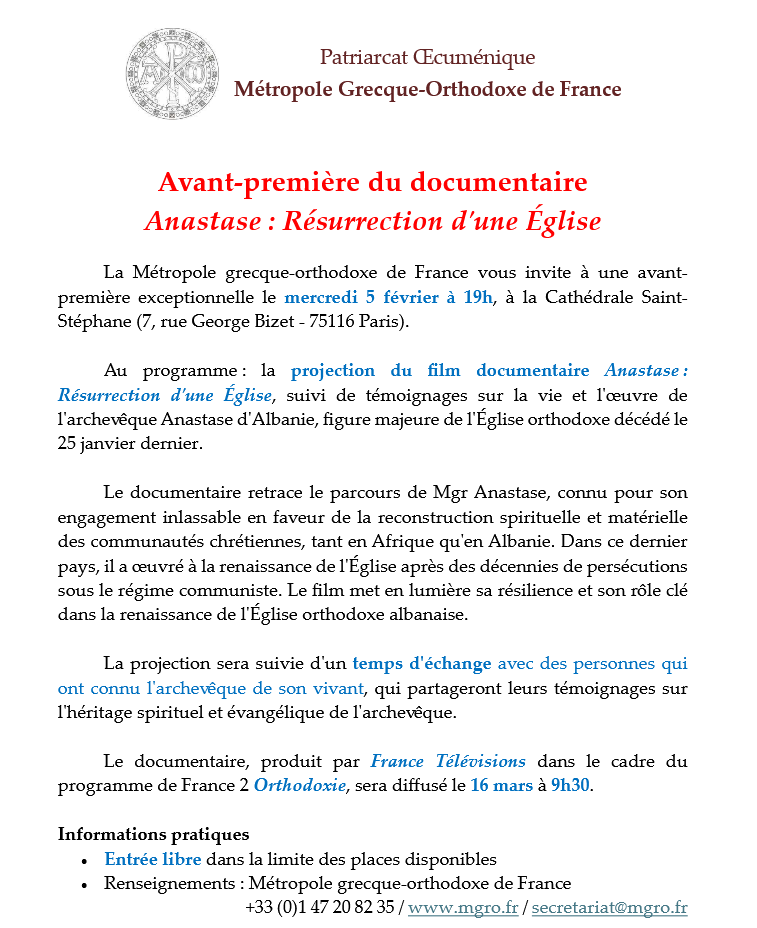 Au programme: la projection du film documentaire « Anastase : Résurrection d’une Église », suivi de témoignages sur la vie et l’œuvre de l’archevêque Anastase d’Albanie, figure majeure de l’Église orthodoxe décédé le 25 janvier dernier.