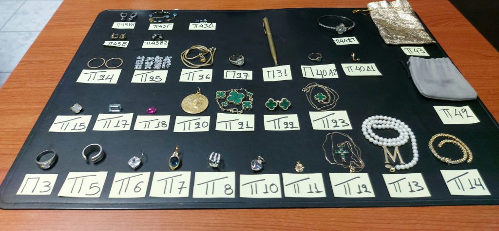 Μετά από συντονισμένες ενέργειες των αστυνομικών, εντοπίστηκε ο προαναφερόμενος άνδρας σε περιοχή της Χαλκιδικής και στην κατοχή του βρέθηκαν και κατασχέθηκαν διάφορα κοσμήματα, το χρηματικό ποσό των 7.810 ευρώ και των 7.100 δολαρίων.