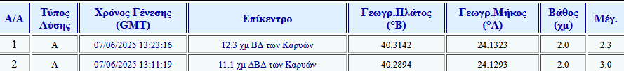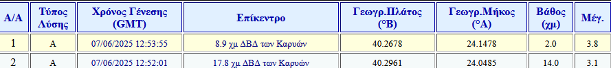 Συγκεκριμένα σημειώθηκε μετασεισμός 3.8 Ρίχτερ και 3.1 Ρίχτερ στις Καρυές, το μεσημέρι του Σαββάτου (07/06).