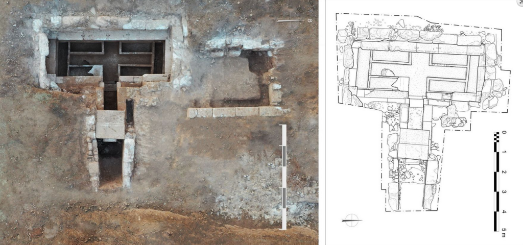 Το ταφικό μνημείο έχει σχήμα ανισοσκελούς «Τ» σε κάτοψη και αποτελείται από δύο ενότητες, τον διάδρομο πρόσβασης διαστάσεων 2,80μ. × 1,20μ. και τον κυρίως ταφικό θάλαμο διαστάσεων 2,75μ. × 7.40μ. Ο ταφικός θάλαμος, ορθογώνιος σε κάτοψη, έχει προσανατολισμένο τον επιμήκη άξονά του Β-Ν, ενώ ο διάδρομος συναντά κάθετα τον ταφικό θάλαμο στο μέσον της ανατολικής μακράς πλευράς του (Εικ. 3). Η πρόσβαση στον ταφικό θάλαμο γίνεται από σχετικά στενό διάδρομο με κατεύθυνση Α-Δ, ο οποίος αποτελείται από ένα υπαίθριο τμήμα, που μπορεί να χαρακτηριστεί «δρόμος» και από ένα στεγασμένο τμήμα, μέρος της οριζόντιας οροφής του οποίου διατηρείται, ενώ η είσοδος στο εν λόγω τμήμα γίνεται μέσω θυραίου ανοίγματος, το οποίο βρέθηκε σφραγισμένο εξωτερικά με ορθογώνια καλυπτήρια πλάκα. Το ανώφλι του ανοίγματος διαμορφώνεται από ένα ορθογώνιο μέλος σε επανάχρηση.