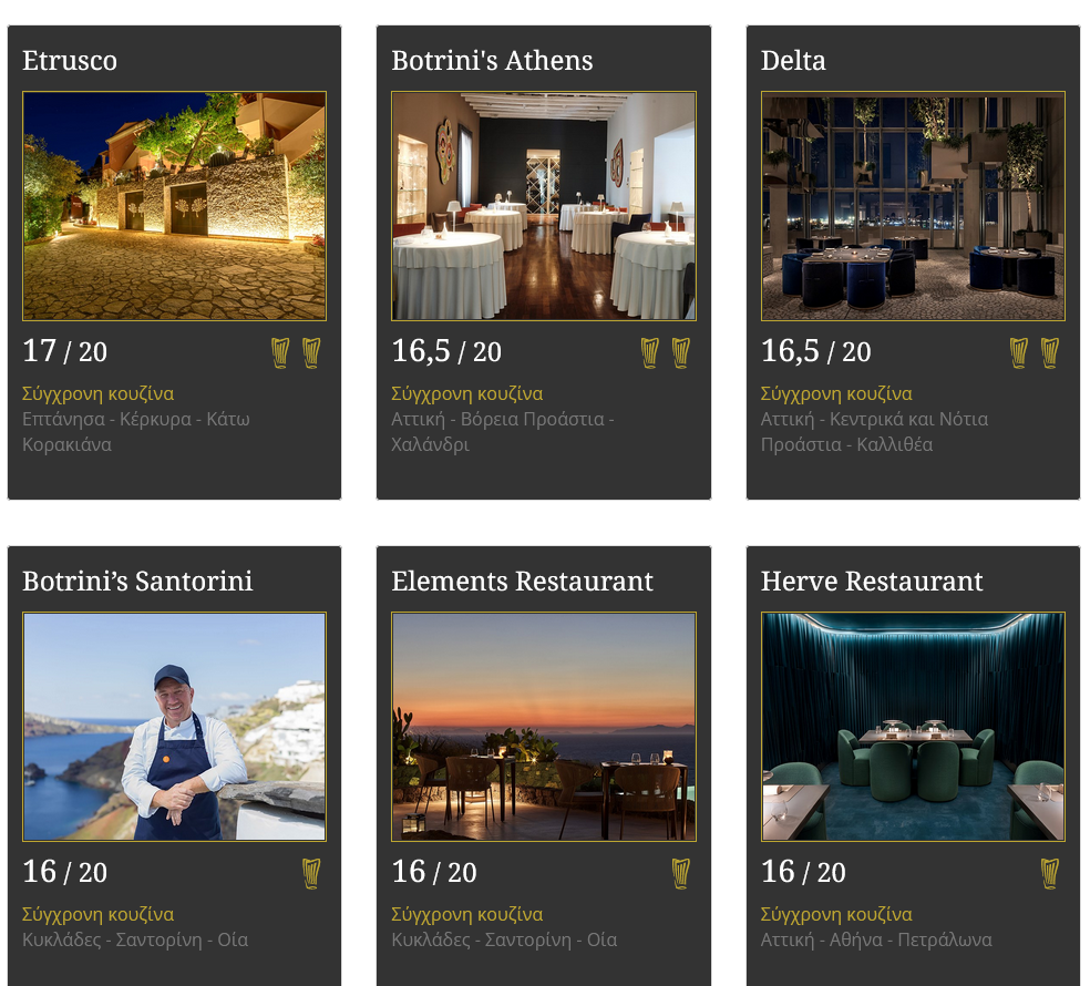 Για 13η χρονιά το εστιατόριο «Etrusco» της Κέρκυρας αναδείχθηκε το καλύτερο της Ελλάδας, με βαθμολογία 17/20 και δύο Χρυσούς Σκούφους. Τα εστιατόρια «Botrini’s Athens» και «Delta» κατέκτησαν τη δεύτερη θέση στην κατάταξη, με βαθμολογία 16,5/20 και δύο Χρυσούς Σκούφους. Είναι η πρώτη φορά στα χρονικά του θεσμού που τρία εστιατόρια κατακτούν στην ίδια απονομή από δύο Χρυσούς Σκούφους το καθένα.