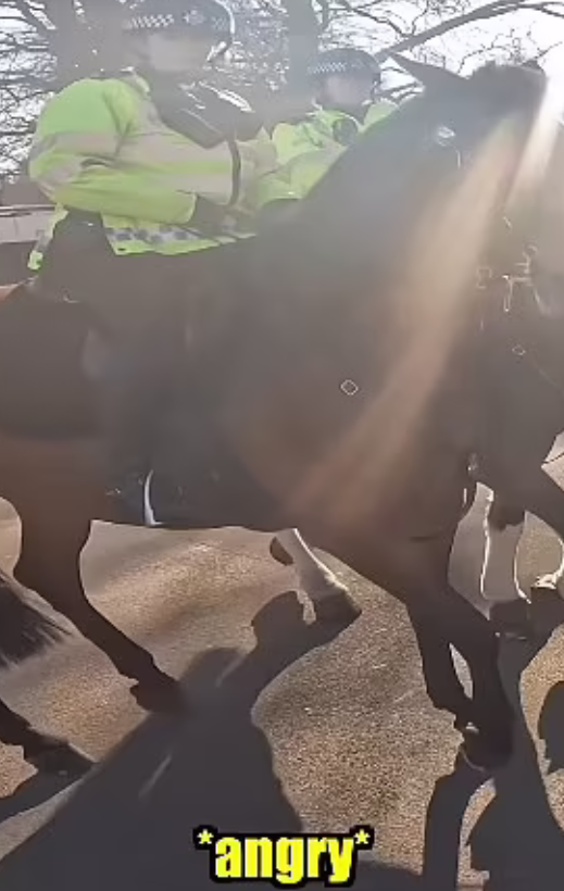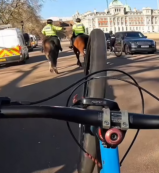 Σε ένα βίντεο που δημοσιεύτηκε στα μέσα κοινωνικής δικτύωσης, ένας ποδηλάτης φαίνεται να πλησιάζει δύο άλογα της αστυνομίας από πίσω με σκοπό να περάσει ανάμεσά τους.