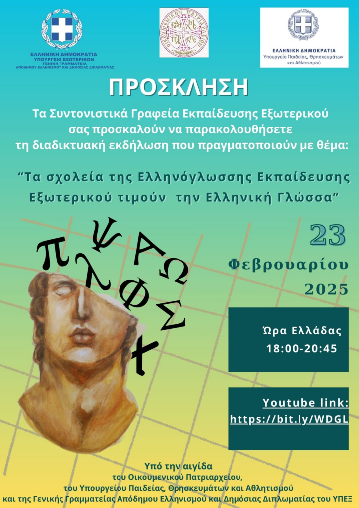 Στο πλαίσιο των εκδηλώσεων για την Παγκόσμια Ημέρα Ελληνικής Γλώσσας τα Συντονιστικά Γραφεία Εκπαίδευσης Εξωτερικού θα πραγματοποιήσουν διαδικτυακή εκδήλωση την Κυριακή 23 Φεβρουαρίου 2025 και ώρα Ελλάδας 18:00 με θέμα «Τα σχολεία της Ελληνόγλωσσης Εκπαίδευσης Εξωτερικού τιμούν την Ελληνική Γλώσσα».