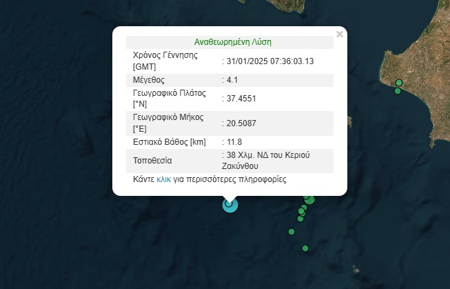 Σεισμική δονήση μεγέθους 4,1 Ρίχτερ σημειώθηκε το πρωί της Παρασκευής (31/1) στη Ζάκυνθο. Σύμφωνα με το Γεωδυναμικό Ινστιτούτου Αθηνών, το επίκεντρο του σεισμού εντοπίζεται 38 χιλιόμετρα Νοτιοδυτικά του Κεριού Ζακύνθου και το εστιακό βάθος υπολογίζεται στα 11,8 χιλιόμετρα.