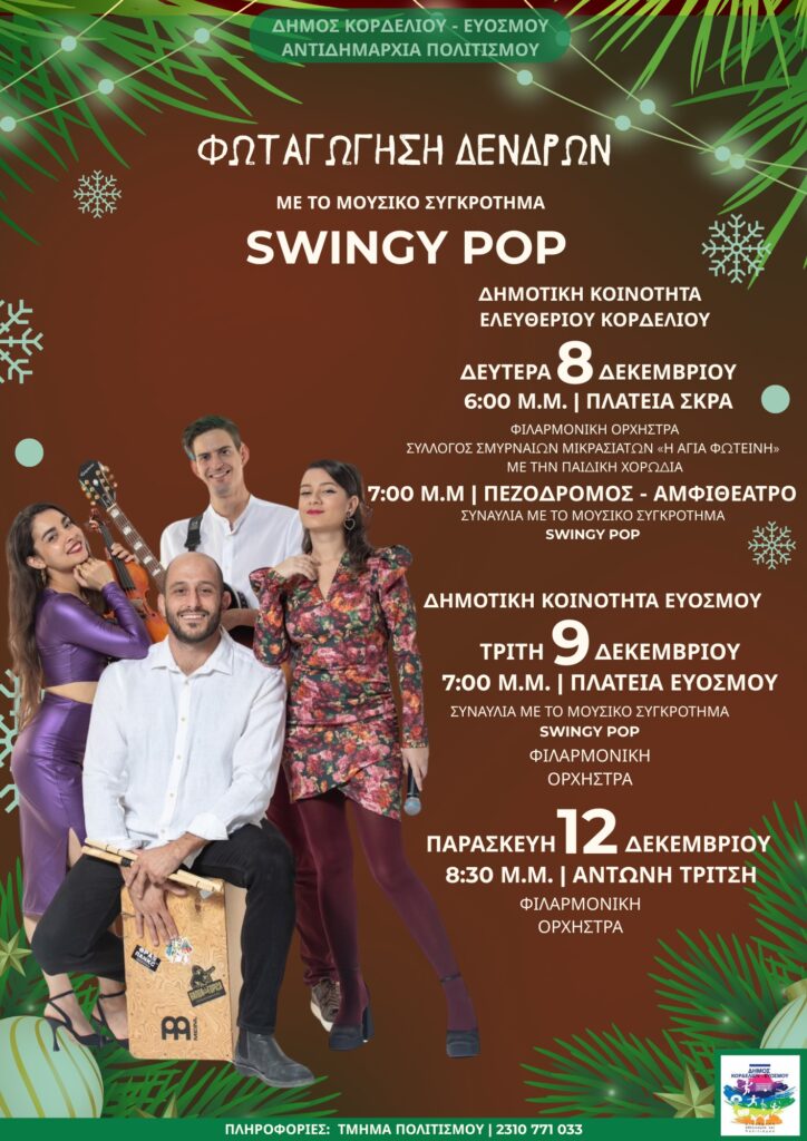 Το μουσικό πρόγραμμα της εκδήλωσης θα πλαισιώσει η Φιλαρμονική Ορχήστρα του Δήμου Κορδελιού – Ευόσμου, ενώ θα ακολουθήσει η παιδική χορωδία του Συλλόγου Σμυρναίων Μικρασιατών Ελευθερίου – Κορδελιού «Η Αγία Φωτεινή», με γλυκές, γιορτινές μελωδίες που θα δημιουργήσουν μια μαγευτική χριστουγεννιάτικη ατμόσφαιρα. Μετά τη λαμπερή έναρξη στην πλατεία Σκρα, η γιορτινή βραδιά συνεχίζεται στο αμφιθέατρο του Πεζόδρομου Ελευθερίου – Κορδελιού, στις 19:00, όπου το μουσικό συγκρότημα SWINGY POP θα ξεσηκώσει μικρούς και μεγάλους.