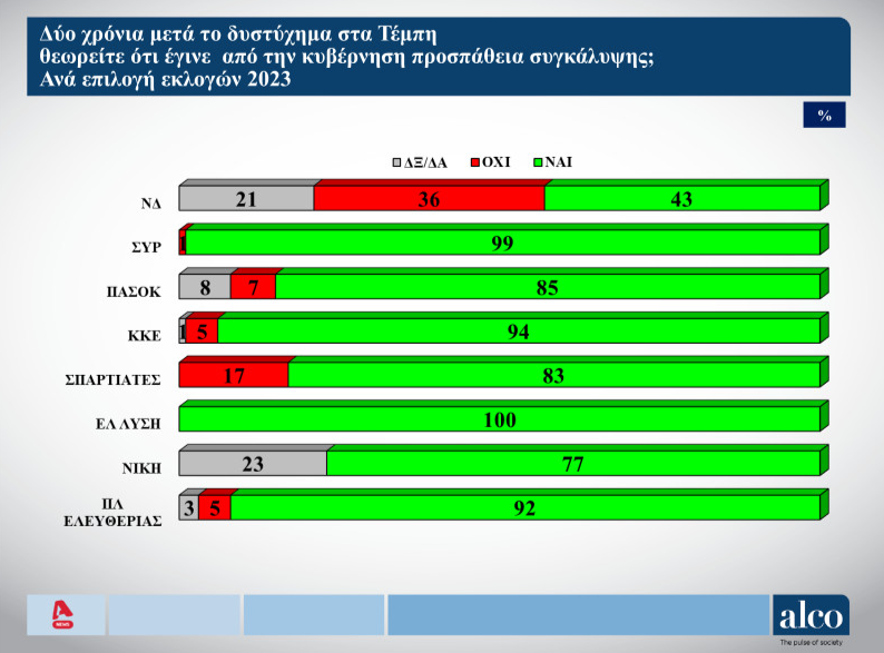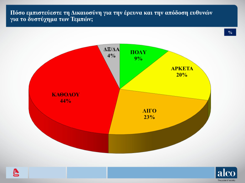 Προσπάθεια συγκάλυψης του δυστυχήματος των Τεμπών από την κυβέρνηση βλέπει η συντριπτική πλειοψηφία της κοινής γνώμης, αντιμετωπίζοντας μάλιστα δύσπιστα τον θεσμό της Δικαιοσύνης σύμφωνα με το πρώτο μέρος της δημοσκόπησης της ALCO, για λογαριασμό του ALPHΑ.