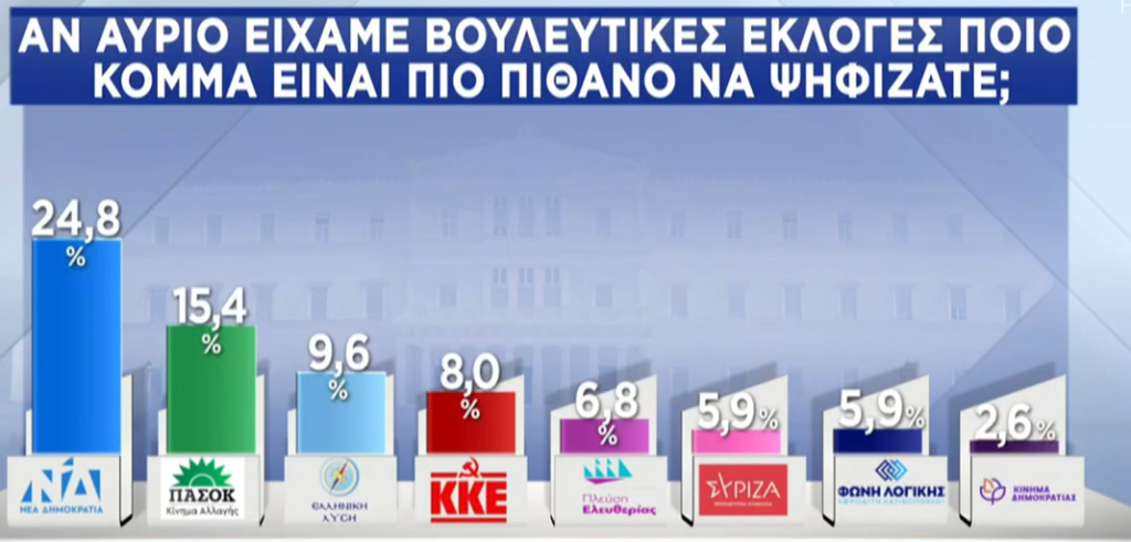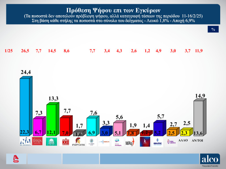 Σε ό,τι αφορά την πρόθεση ψήφου επί των εγκύρων πρώτο κόμμα παραμένει η ΝΔ συγκεντρώνοντας 24,4% (υποχωρώντας από το 26,5% στην έρευνα του Ιανουαρίου), δεύτερο κόμμα το ΠΑΣΟΚ με 13,3% (από 14,5%), τρίτο κόμμα το ΚΚΕ με 7,7% (από 8,6%), τέταρτο κόμμα η Ελληνική Λύση με 7,6% (από 7,7%) και πέμπτο κόμμα ο ΣΥΡΙΖΑ με 7,3% (από 7,7%).