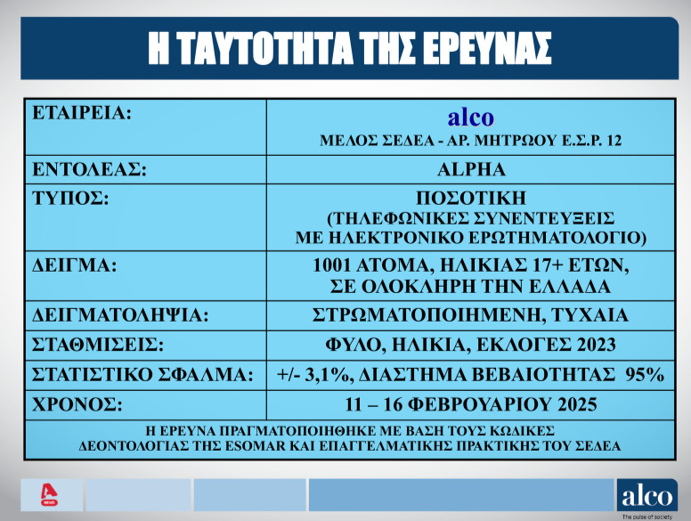 Το δεύτερο μέρος της δημοσκόπησης θα παρουσιαστεί στο κεντρικό Δελτίο Ειδήσεων του ALPHA την Πέμπτη.