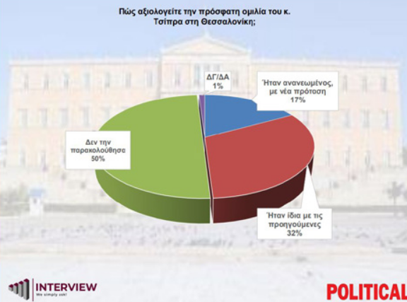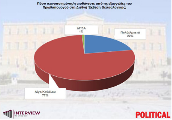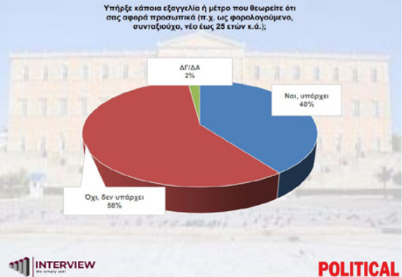 Πολιτικά, το 77% δεν είναι ικανοποιημένο από τα μέτρα που εξήγγειλε ο Πρωθυπουργός ενώ το 58% των πολιτών δηλώνει ότι τα μέτρα δεν θα βελτιώσουν την καθημερινότητά τους, καθώς “δεν τους αφορούν”.