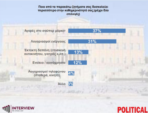 Η ακρίβεια στο σούπερ μάρκετ και στους λογαριασμούς ενέργειας είναι τα δύο σοβαρότερα ζητήματα που απασχολούν τα ελληνικά νοικοκυριά, με τις τυχόν έκτακτες δαπάνες να βρίσκονται στην τρίτη θέση.