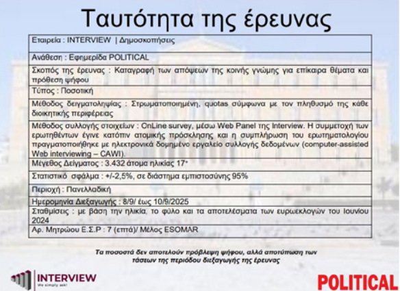Πανελλαδική δημοσκόπηση πραγματοποίησε η Interview για την Political μετά τις εξαγγελίες του Κυριάκου Μητσοτάκη στην 89η ΔΕΘ.