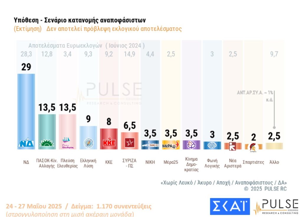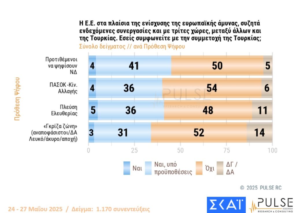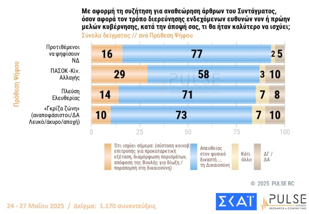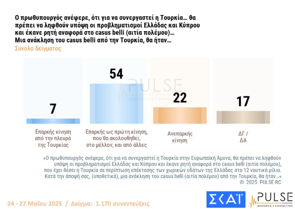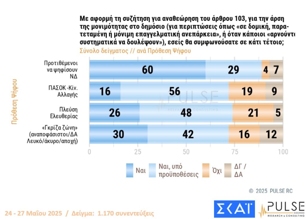 1 thought on “Δημοσκόπηση PULSE για ΣΚΑΪ – Άρση μονιμότητας στο Δημόσιο, ελληνοτουρκικά, πρόθεση ψήφου”