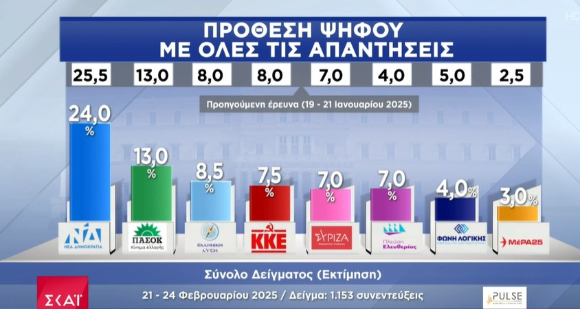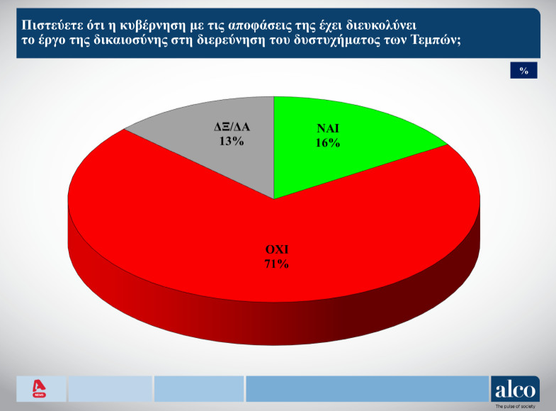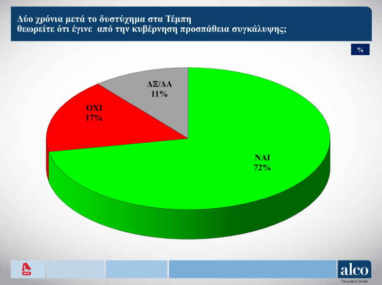 Στις 19/02/25 δημοσκόπηση είχε παρουσιάσει ο ALPHA και η Alco – την οποία είχε αναρτήσει και ο ΣΚΑΪ – για την τραγωδία των Τεμπών αλλά και την πρόθεση ψήφου των πολιτών.