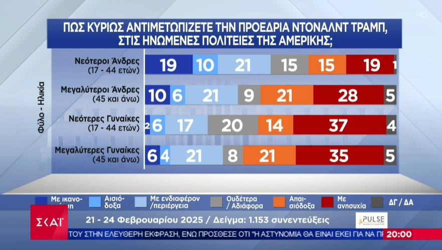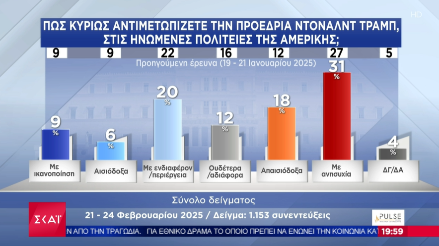 Πολιτικούς δείκτες, πρόθεση ψήφου αλλά η προεδρία του Ντοναλντ Τραμπ ήταν μερικές από τις ερωτήσεις της δημοσκόπησης του ΣΚΑΪ και της Pulse που παρουσιάστηκε στο κεντρικό δελτίο ειδήσεων του σταθμού.