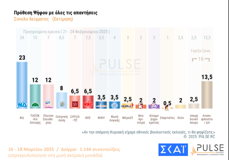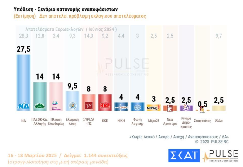 2 thoughts on “Δημοσκόπηση ΣΚΑΪ & Pulse – Πρώτη η ΝΔ, στη 2η θέση ΠΑΣΟΚ και Πλεύση Ελευθερίας”