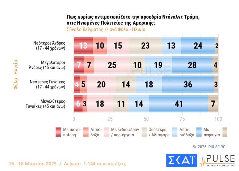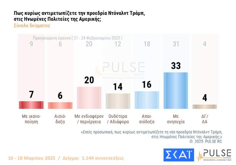 Η δημοσκόπηση της Pulse συμπεριέλαβε στο ερωτηματολόγιό της και τα μέχρι στιγμής δείγματα της προεδρίας του Ντόναλντ Τραμπ, ο οποίος, με τις αποφάσεις του, επανακαθορίζει τις ισορροπίες σε παγκόσμιο επίπεδο.