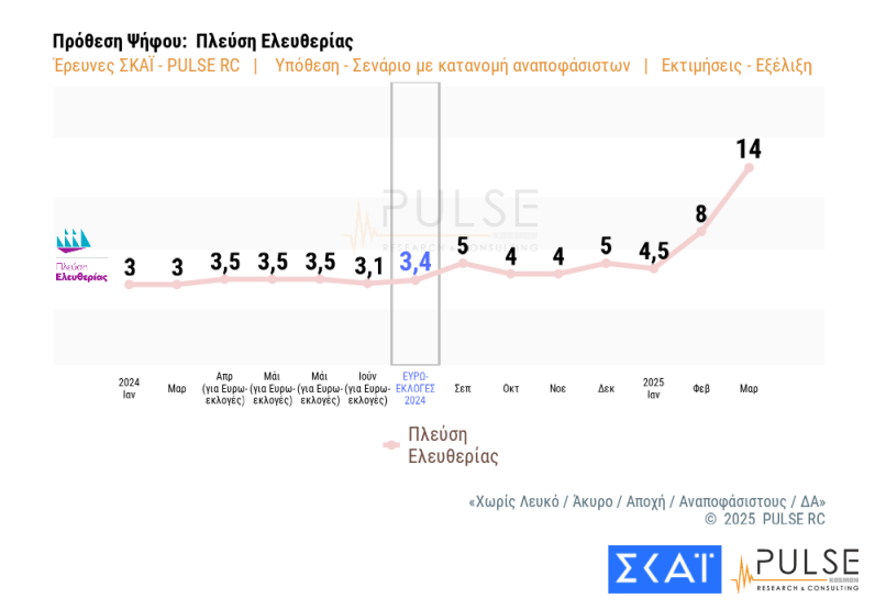 Η μεγάλη δημοσκόπηση του ΣΚΑΪ, την οποία διεξήγαγε η εταιρεία Pulse και παρουσιάστηκε στο κεντρικό δελτίο ειδήσεων του σταθμού με τη Σία Κοσιώνη, επιβεβαίωσε το νέο πολιτικό σκηνικό που δείχνει να διαμορφώνεται, με τη Νέα Δημοκρατία να παραμένει πρώτο κόμμα, ,με χαμηλά ωστόσο ποσοστά σε σχέση με τις τελευταίες εθνικές εκλογές και την Πλεύση Ελευθερίας να διεκδικεί ανοιχτά τη δεύτερη θέση, την οποία μοιράζεται με το ΠΑΣΟΚ.