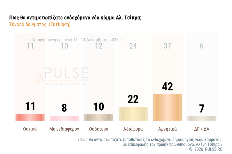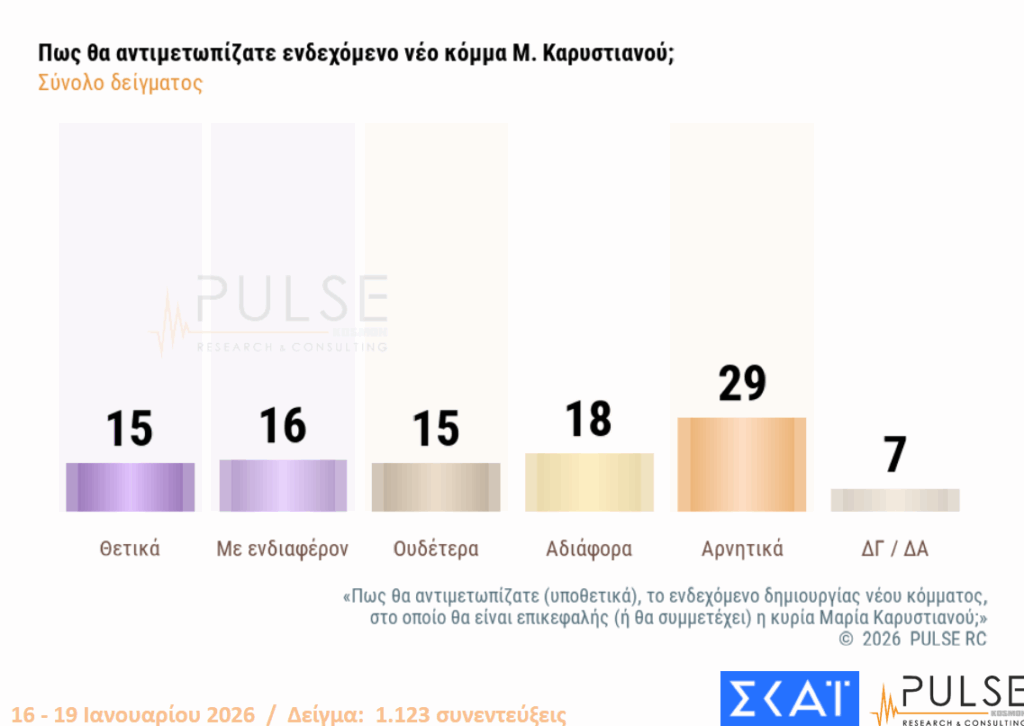 Η έρευνα διενεργήθηκε σε δείγμα 1.123 πολιτών, στο διάστημα 16-19 Ιανουαρίου, το υπό κατασκευή κόμμα που δείχνει να συγκεντρώνει το μεγαλύτερο ποσοστό αποδοχής, είναι η κίνηση της Μαρίας Καρυστιανού, με το «κόμμα» του πρώην πρωθυπουργού Αλέξη Τσίπρα να ακολουθεί και το «κόμμα» του επίσης πρώην πρωθυπουργού Αντώνη Σαμαρά.
