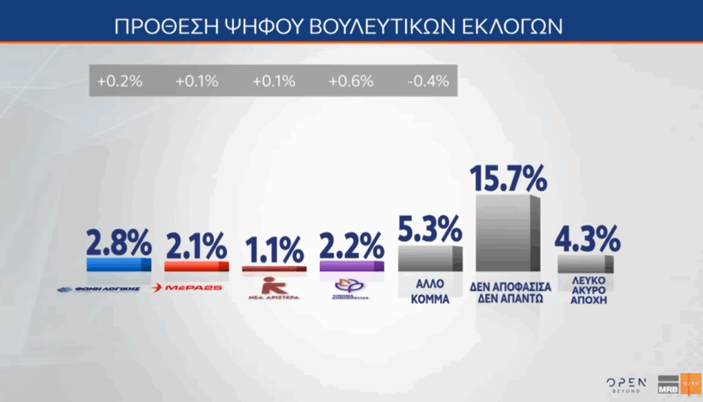 Πρόθεση ψήφου – 17,1 μονάδες διαφορά μεταξύ ΝΔ και ΠΑΣΟΚ