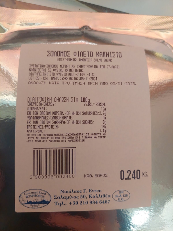 Συγκεκριμένα, πρόκειται για καπνιστό σολωμό φιλέτο με την εμπορική ονομασία «GOURMET FOOD BOSRHOROUS», το οποίο διακινείται στην Ελλάδα σε συσκευασίες των 240 g, από την επιχείρηση «Νικόλαος Γ. Evren» (Σαλαμίνος 50, Καλλιθέα Αττικής).