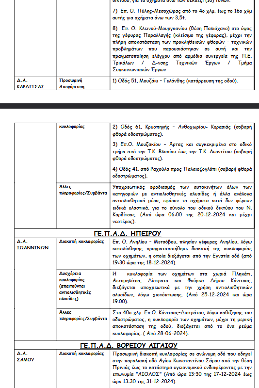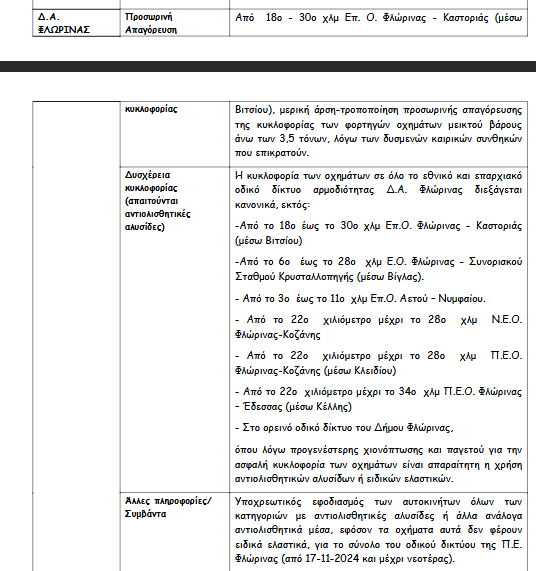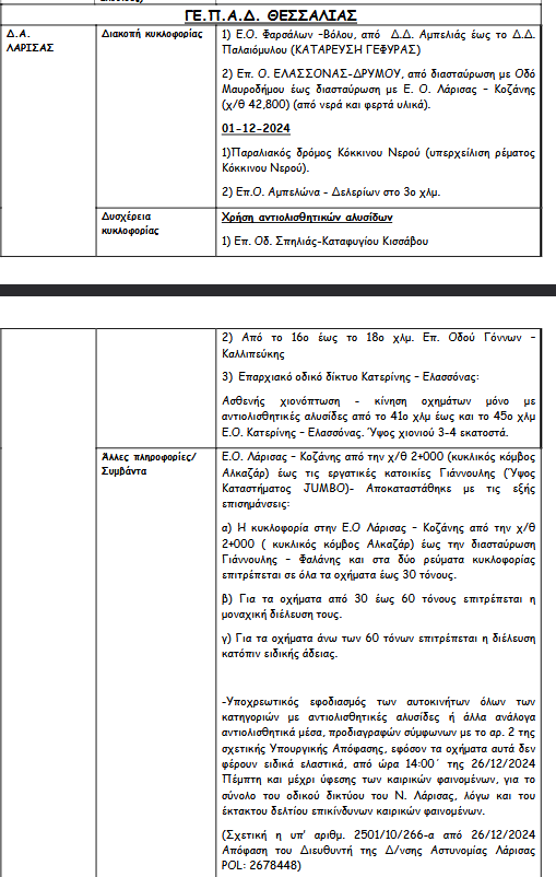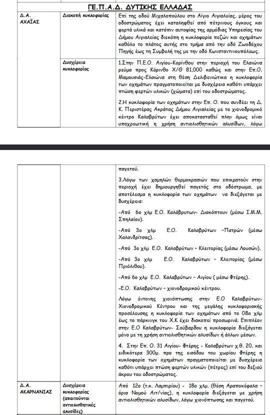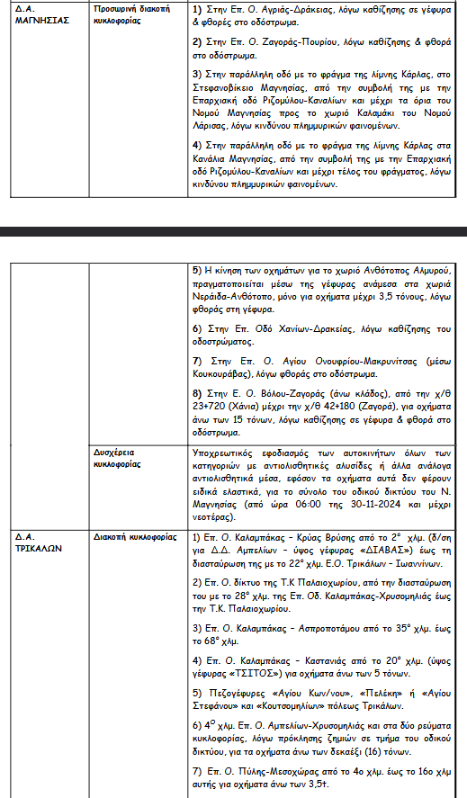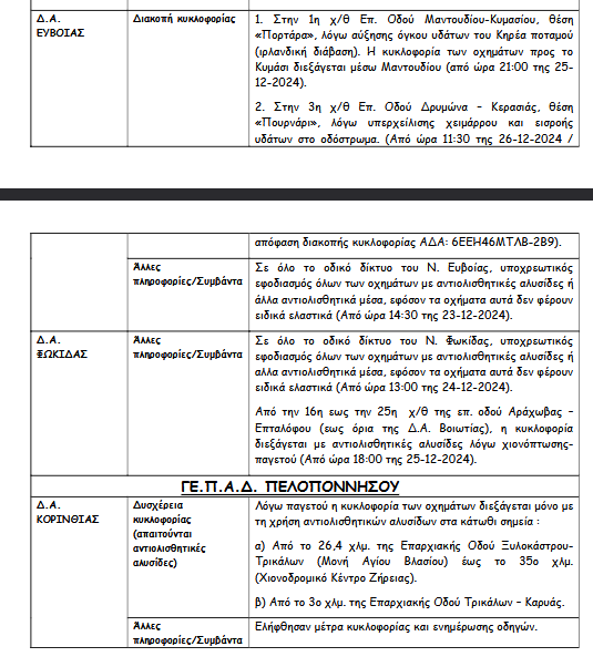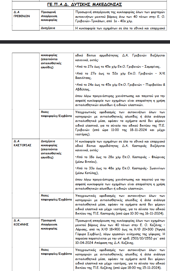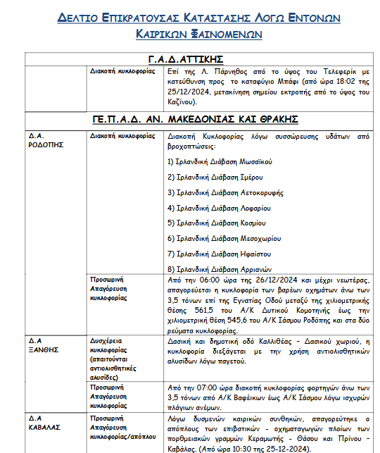 Σύμφωνα με ανακοίνωση της ΕΛ.ΑΣ λόγω των έντονων καιρικών φαινομένων έχουν εφαρμοστεί κυκλοφοριακές ρυθμίσεις με διακοπές στην κυκλοφορία ή προσωρινές απαγορεύσεις. Επίσης επισημαίνεται σε ποιες περιοχές υπάρχει δυσχέρεια στην κυκλοφορία των οχημάτων.