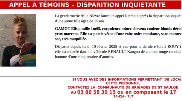 La gendarmerie de la Nièvre lance un appel à témoins pour la disparition d’Elisa Gamot, 15 ans. Elisa a disparue depuis trois jours (10/02/25)