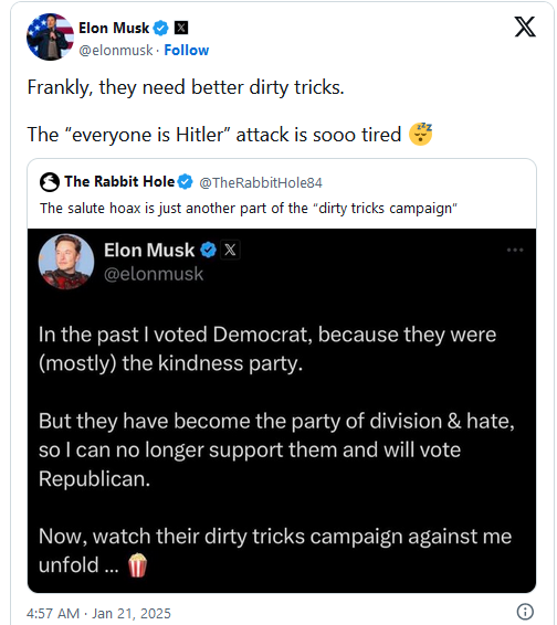 Στην πρώτη του αντίδραση μετά τον σάλο, ο Έλον Μασκ δημοσίευσε παλιότερη ανάρτηση από τον λογαριασμό The Rabbit Hole, απορρίπτοντας τις κατηγορίες εις βάρος του, τις οποίες απέδωσε σε μία ευρύτερη καμπάνια δυσφήμισης. «Η επίθεση του: ”Όλοι είναι Χίτλερ” έχει κουράσει (παλιώσει) πολύ», έγραψε, προσθέτοντας πως «ειλικρινά, χρειάζονται καλύτερα βρώμικα κόλπα».