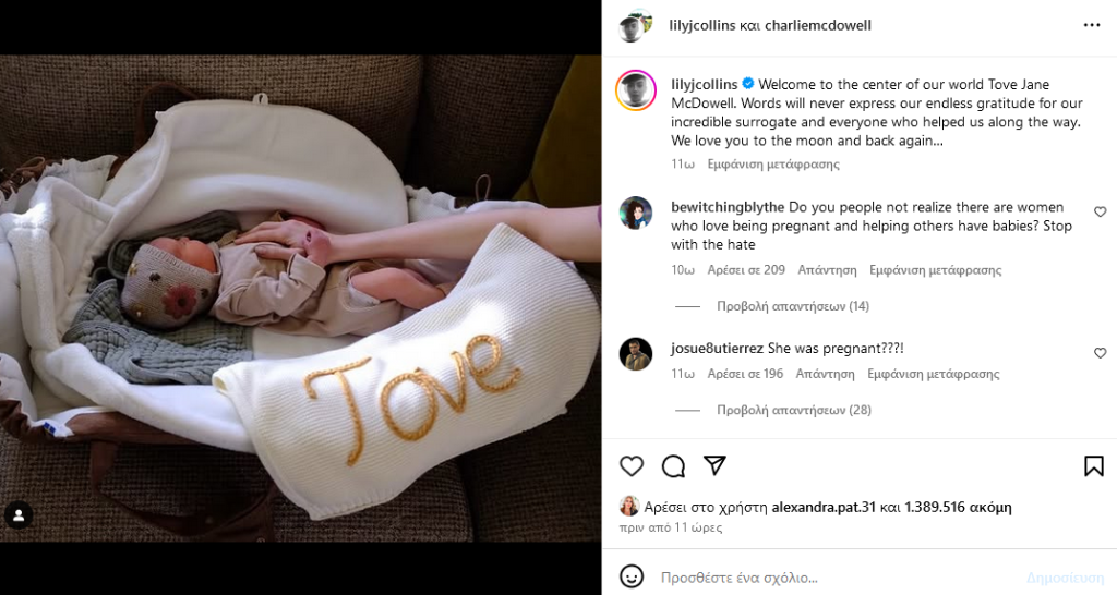 «Καλωσόρισες στο κέντρο του κόσμου μας, Tove Jane McDowell», έγραψε η Κόλινς σε μια τρυφερή ανάρτηση που μοιράστηκε με τον σύζυγό της στο Instagram.