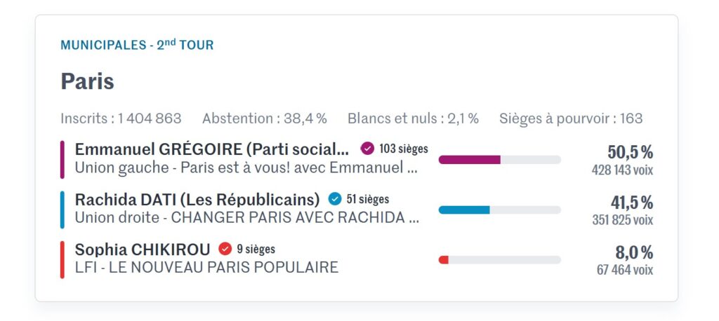 Απέναντί του, η Rachida Dati (υποστηριζόμενη από Les Républicains, MoDem και άλλες δυνάμεις της δεξιάς-κέντρου) έλαβε 41,52 % (351.825 ψήφοι) και 51 έδρες.