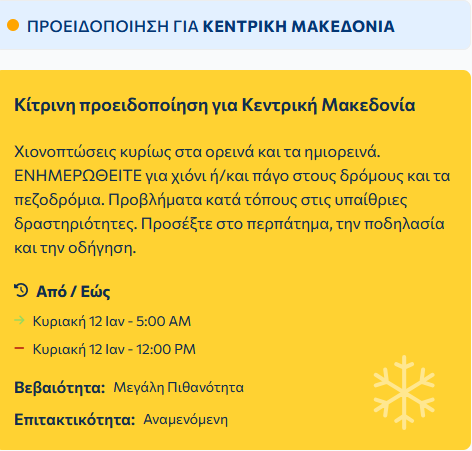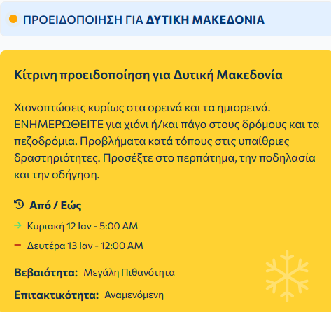 Στη δυτική Μακεδονία ιδιαίτερα πυκνές χιονοπτώσεις θα σημειωθούν σε ορεινές- ημιορεινές από τις πρωινές ώρες και από τις μεσημβρινές ώρες και σε περιοχές με χαμηλότερο υψόμετρο.