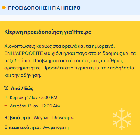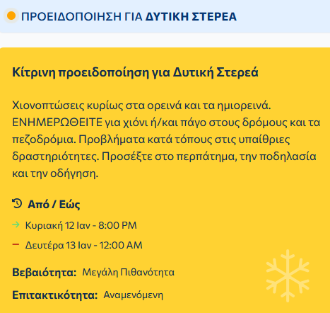 Επιδείνωση θα παρουσιάσει ο καιρός από την Κυριακή (12-01-25) έως την Τρίτη (14-01-25) σύμφωνα με την Εθνική Μετεωρολογική Υπηρεσία στη δυτική, την κεντρική και τη βόρεια Ελλάδα με βροχές και καταιγίδες, τοπικά ισχυρές κυρίως στα δυτικά. Χιονοπτώσεις θα σημειωθούν στα ορεινά ηπειρωτικά καθώς και στα ημιορεινά της κεντρικής και βόρειας χώρας.