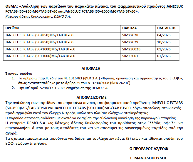 “Αποφασίζουμε την ανάκληση των παρτίδων του παραπάνω πίνακα, του φαρμακευτικού προϊόντος JANECLUC FCTABS (50+850)MG/TAB BTx60 και JANECLUC FCTABS (50+1000)MG/TAB BTx60, λόγω αποτελεσμάτων εκτός προδιαγραφών κατά τον έλεγχο νιτροζαμινών στο πλαίσιο ελέγχων σταθερότητας.