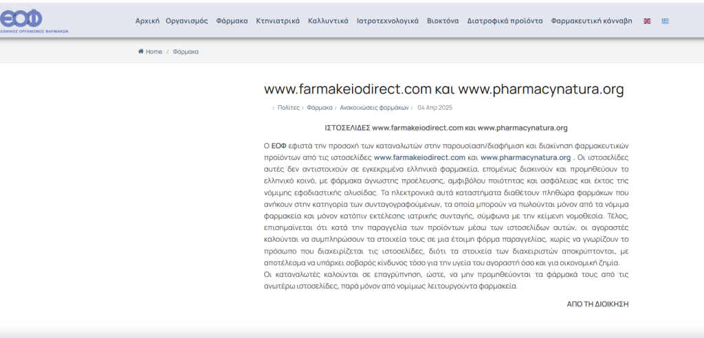 Ο Εθνικός Οργανισμός Φαρμάκων (ΕΟΦ) εφιστά την προσοχή των καταναλωτών στην παρουσίαση/διαφήμιση και διακίνηση φαρμακευτικών προϊόντων από τις ιστοσελίδες www.farmakeiodirect.com και www.pharmacynatura.org.