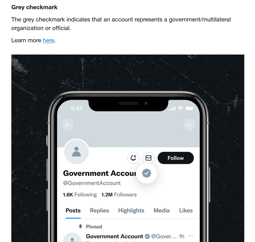 Για όσους δε γνωρίζουν, το γκρι τικ δίπλα από το όνομα ενός χρήστη, σημαίνει ότι ο λογαριασμός αντιπροσωπεύει έναν κυβερνητικό/πολυμερή οργανισμό ή αξιωματούχο.