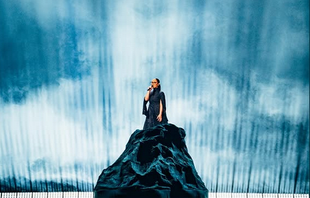 This is a completely different presentation of the song from the one we watched in the National Final. Klavdia begins her presence on the Eurovision stage on a pier. Her movement, as she heads towards a rock, symbolizes the fiery path of every person towards the Light. The presence of a second person, combined with the movement of the stage, indicate the separation that “Asteromata” speaks about.