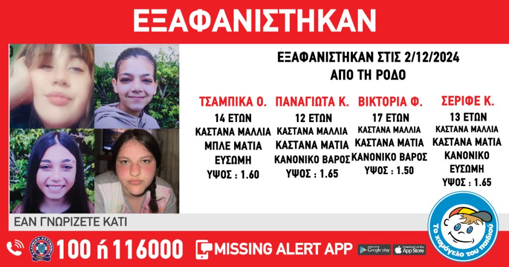 Στις 02/12/24, στις 20:30, εξαφανίστηκαν η Τσαμπίκα Οικ. 14 ετών, η Παναγιώτα-Κυριακή Κ. 12 ετών, η Βικτωρία Φ. 12 ετών και η Σεριφέ Κ. 13 ετών, από το χώρο φιλοξενίας στον οποίο διέμεναν στη Ρόδο. Το Χαμόγελο του Παιδιού ενημερώθηκε και κατόπιν εισαγγελικής εντολής προχώρησε άμεσα στη δημοσιοποίηση των στοιχείων των τεσσάρων κοριτσιών.